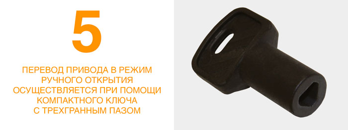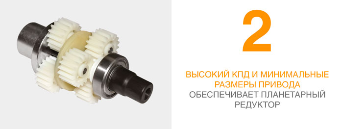 Червячная передача и планетарный редуктор образуют самоблокирующуюся систему, которая обеспечивает механическую блокировку створки при выключенном двигателе. Удобная и безопасная система расцепления позволяет вручную открывать или закрывать створку в случае отсутствия электропитания или каких-либо неисправностей в блоке управления.