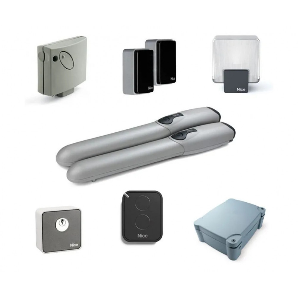 Комплект для распашных ворот NICE WINGO4KCE для створок шириной до 2 м и массой до 400 кг; интенсивность 50%, класс защиты IP44; диапазон рабочих температур от -20°С до +55°С; напряжение питания 230В; тип привода линейный электромеханический; интенсивность 30 циклов/час. Состав комплекта: Привод WG4000 - 2 шт, блок управления A60/A - 1 шт, приемник SMXI - 1 шт, фотоэлементы EPM - 1 пара, замковый переключатель EKS - 1 шт, лампа ELAC - 1шт, пульт - 1 шт.